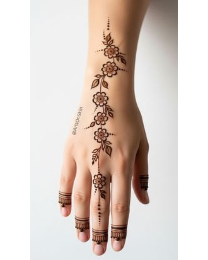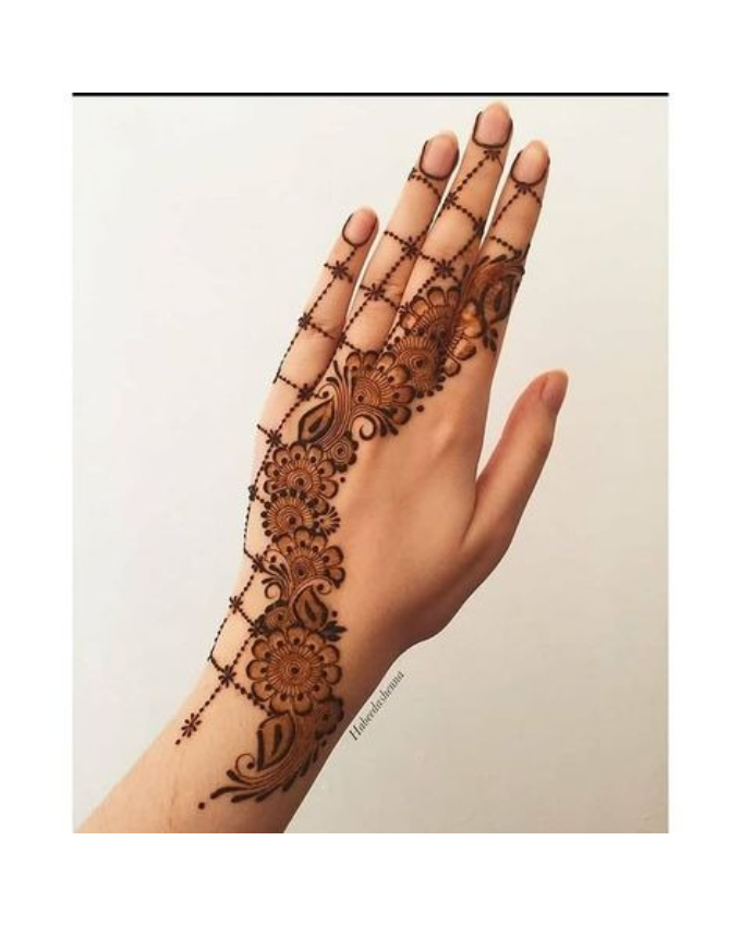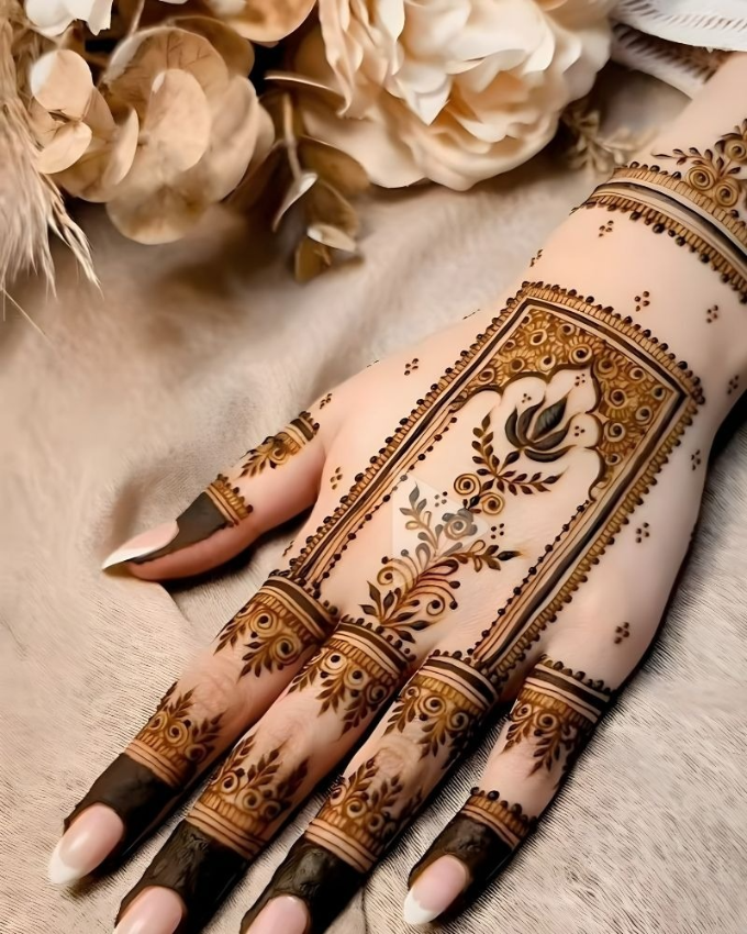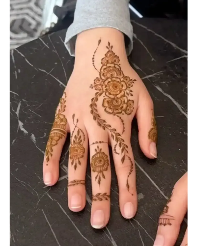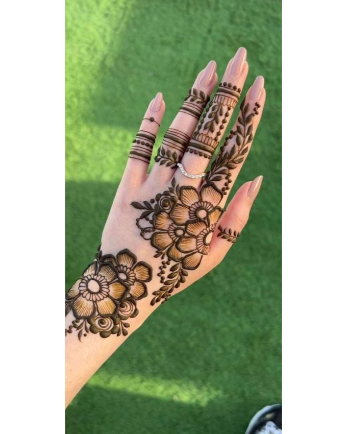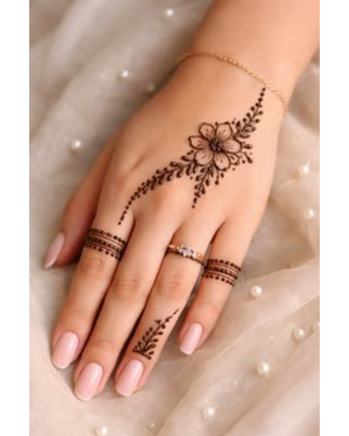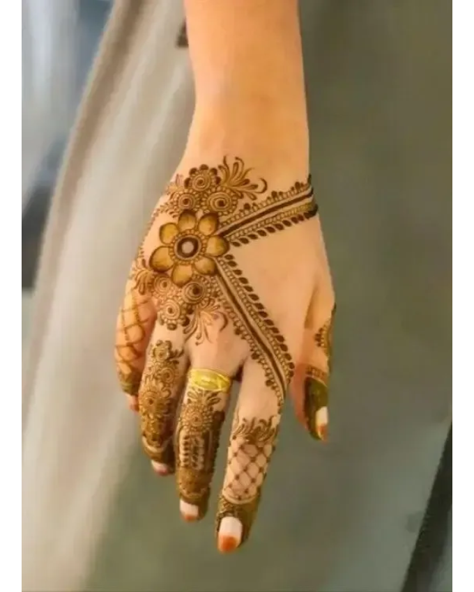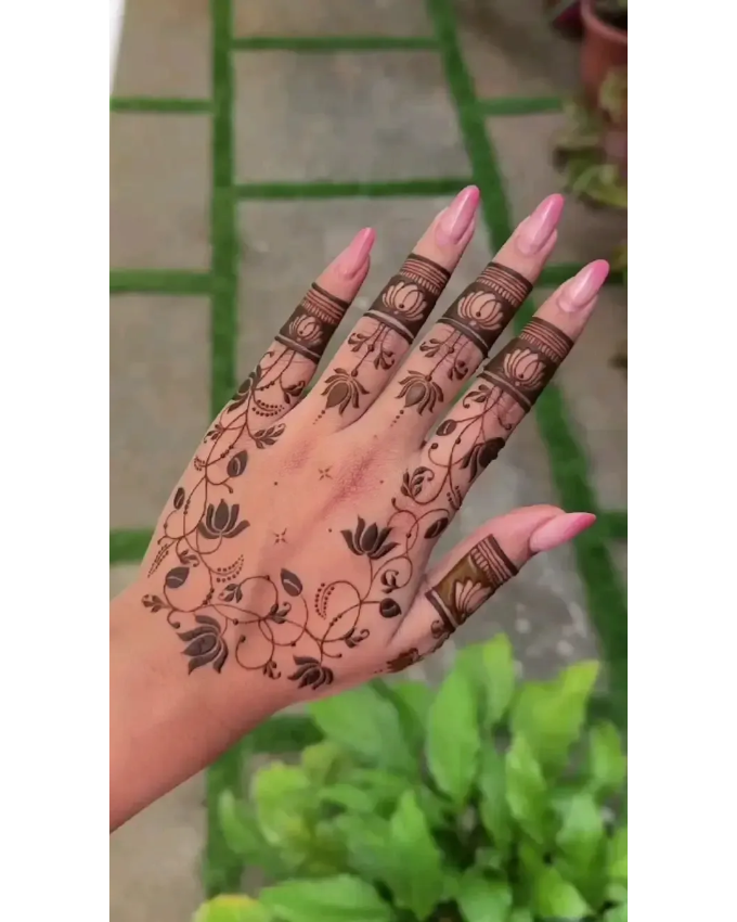 A large, detailed flower or mandala in the centre of the back hand, with vine trails extending toward each finger, is a timeless mehndi design for back hand. This style looks stunning when the henna dries dark and is a crowd favourite for its balanced, symmetrical beauty.