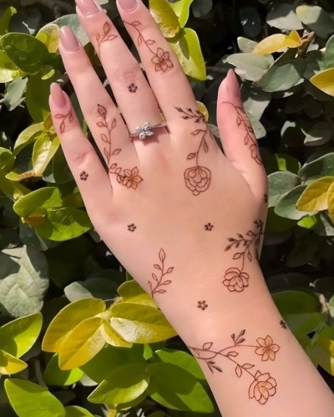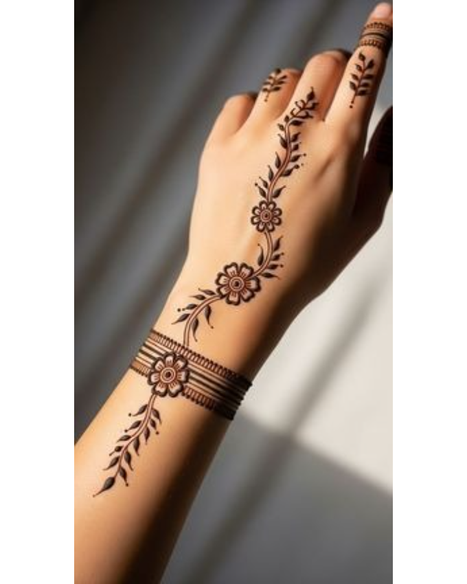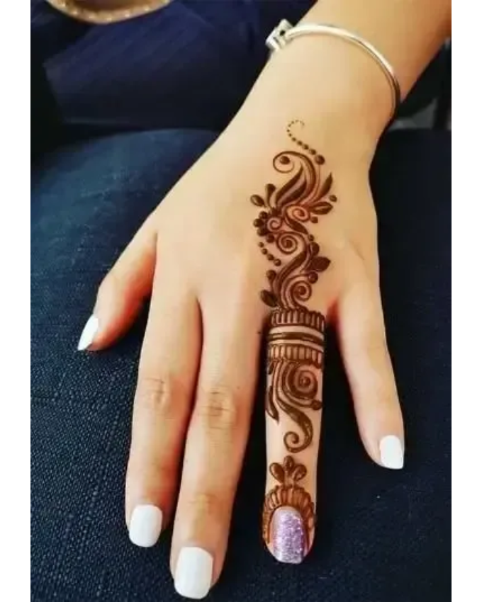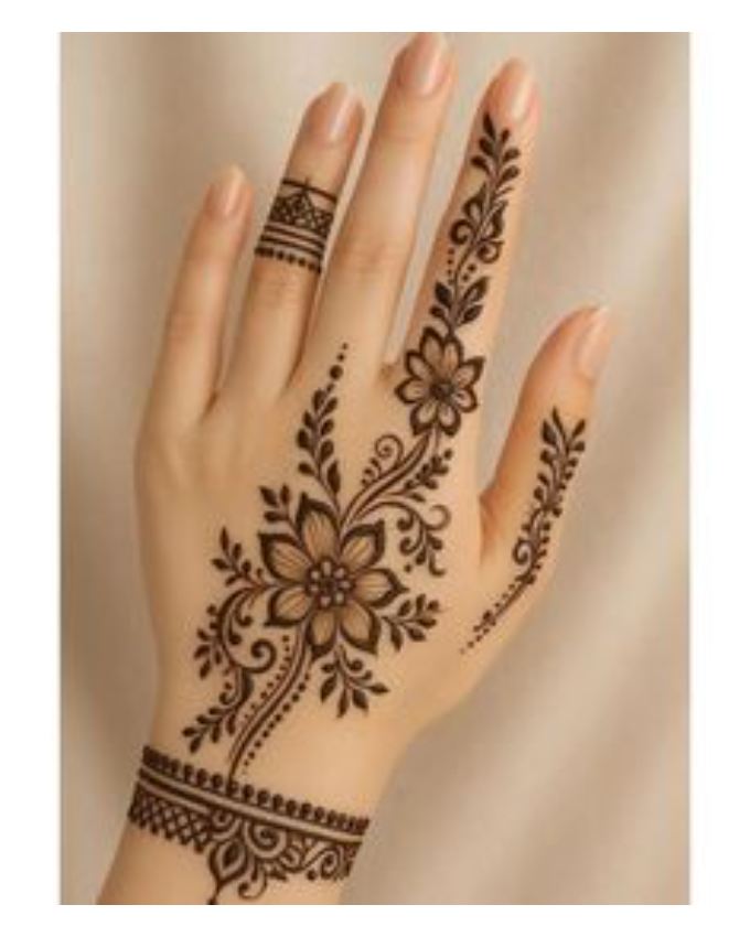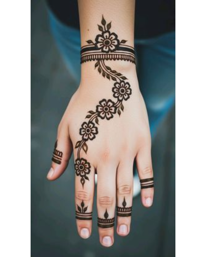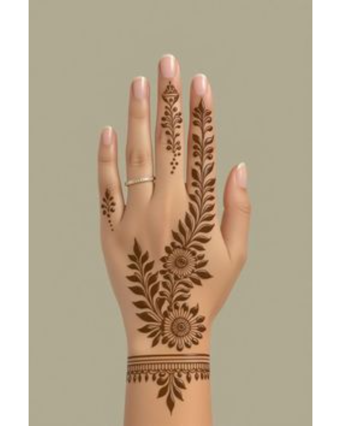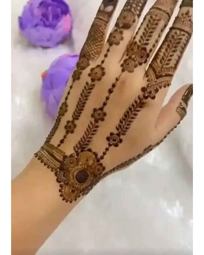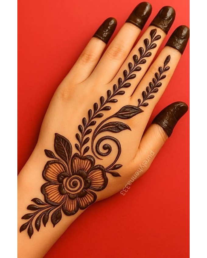 A large, detailed flower or mandala in the centre of the back hand, with vine trails extending toward each finger, is a timeless mehndi design for back hand. This style looks stunning when the henna dries dark and is a crowd favourite for its balanced, symmetrical beauty.