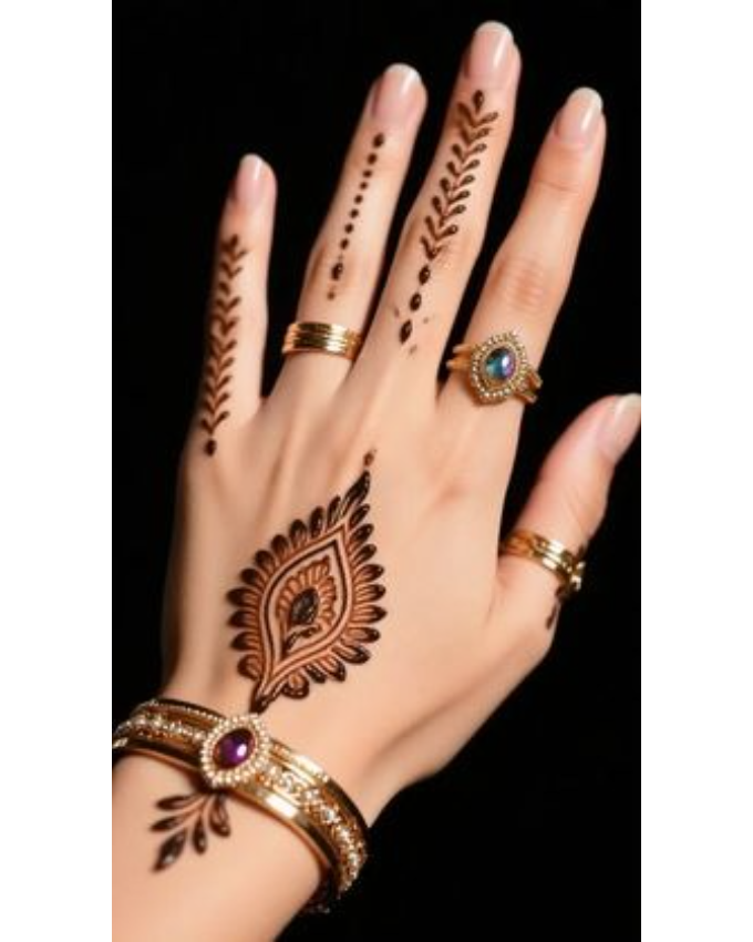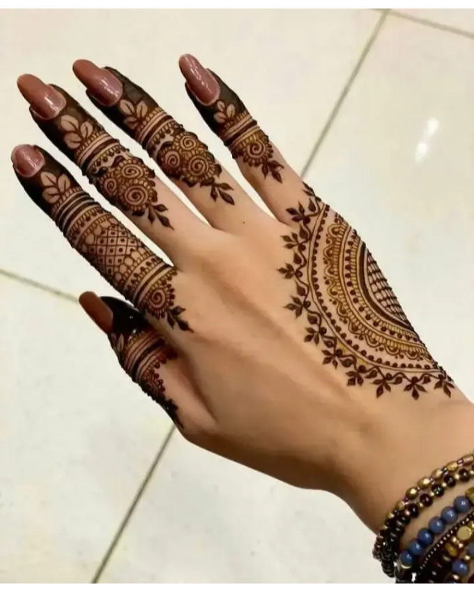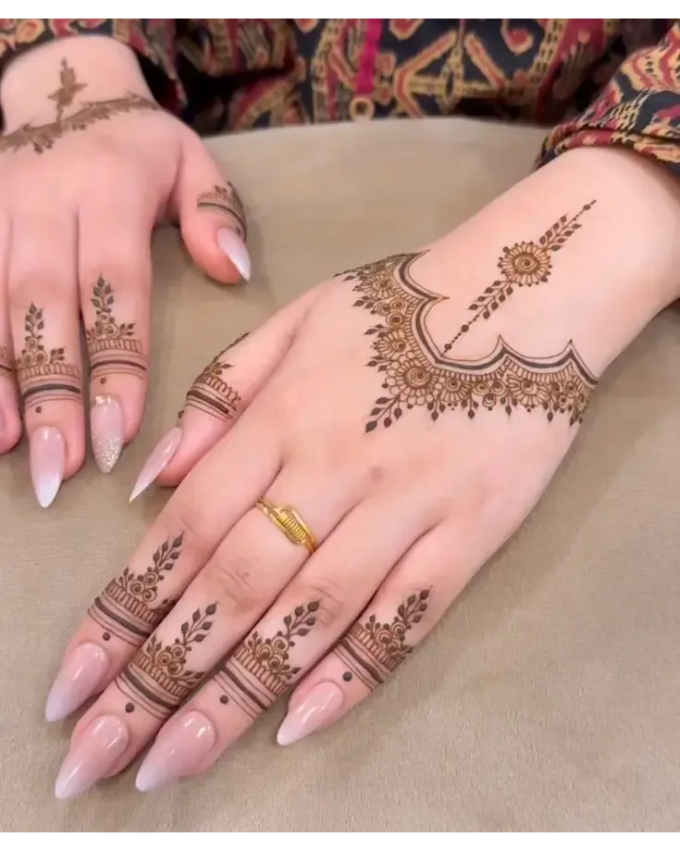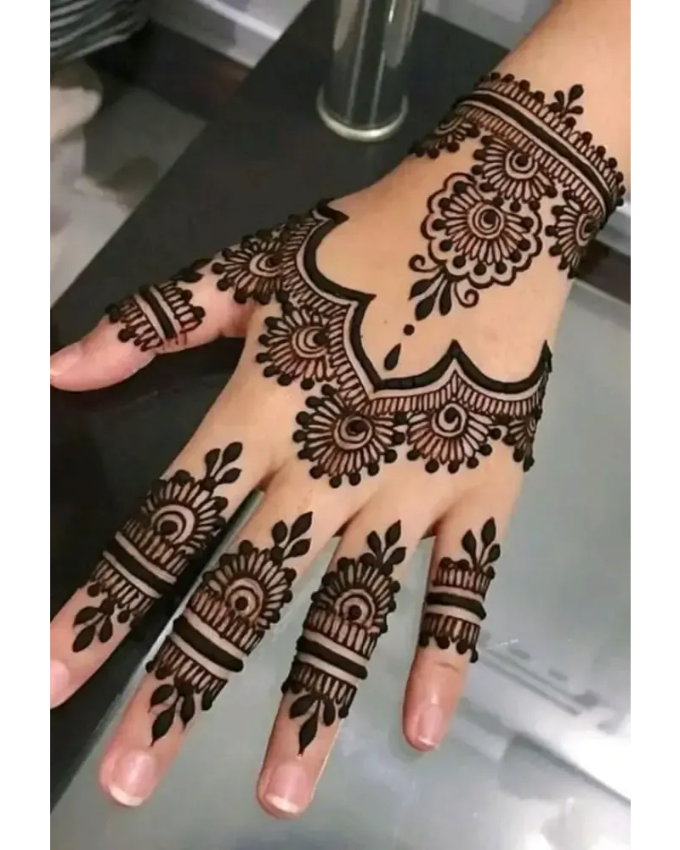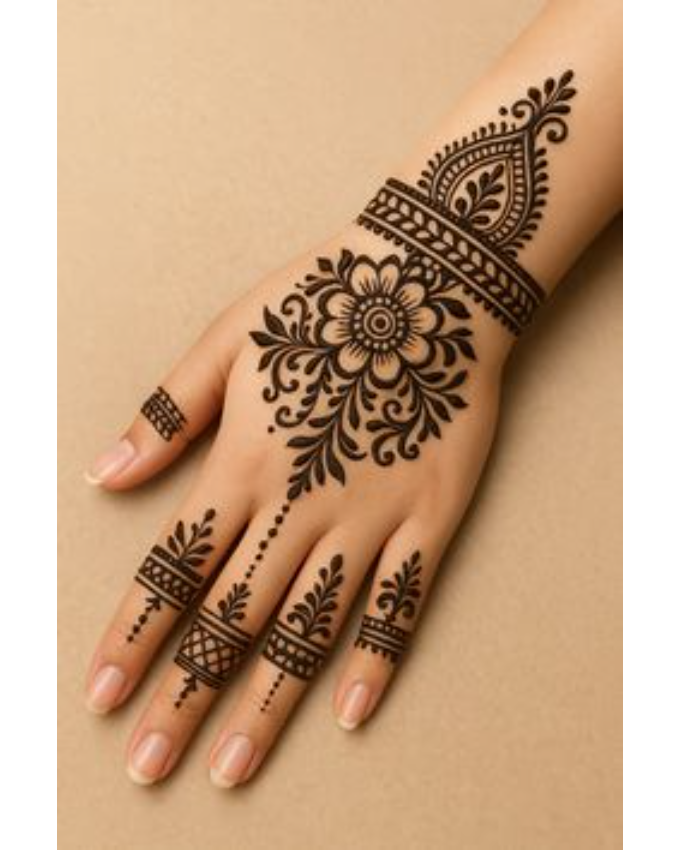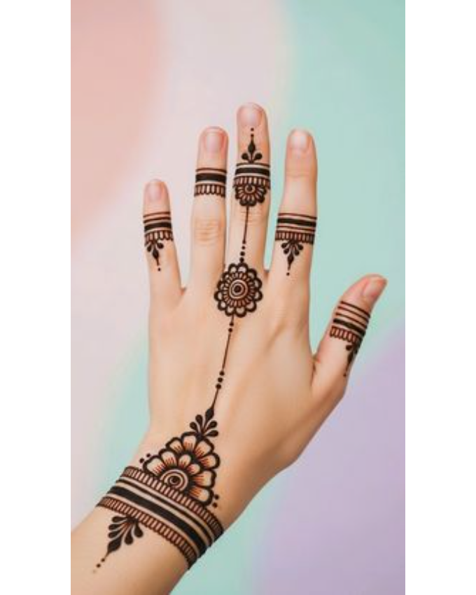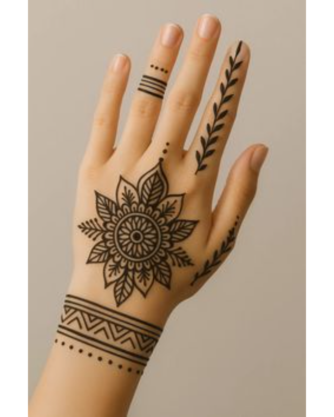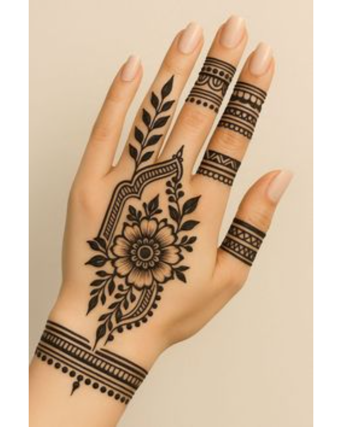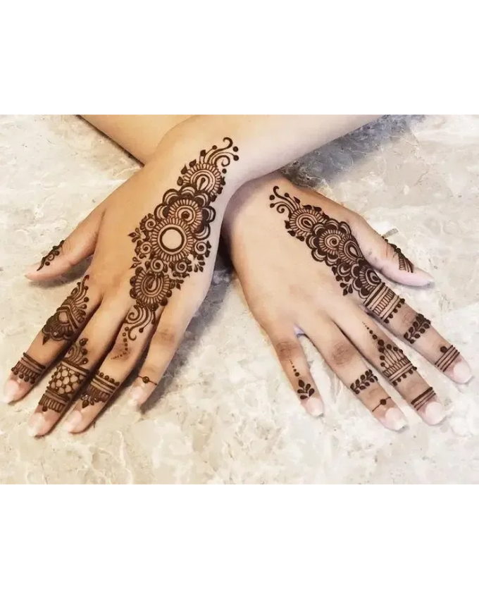 Not everyone has the time or patience for a full, elaborate design. An easy modern back hand mehndi design focuses on clean geometric patterns, simple mandala rings on select fingers, and a neat central motif. These designs typically take 20–30 minutes to apply and still deliver a polished, stylish result.