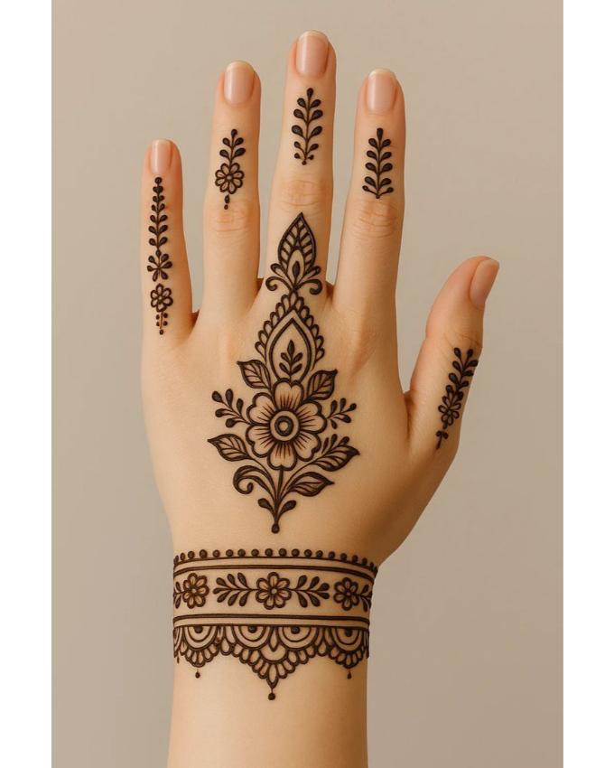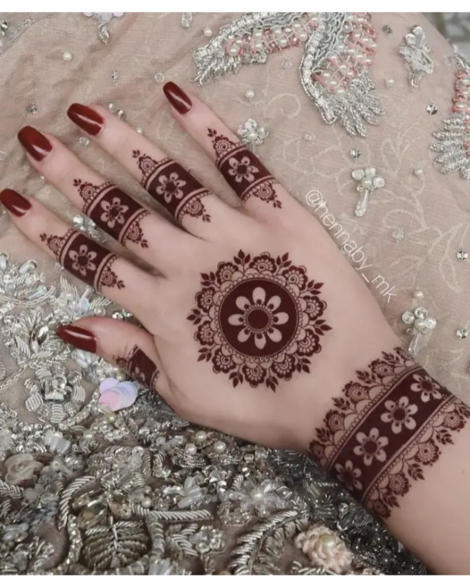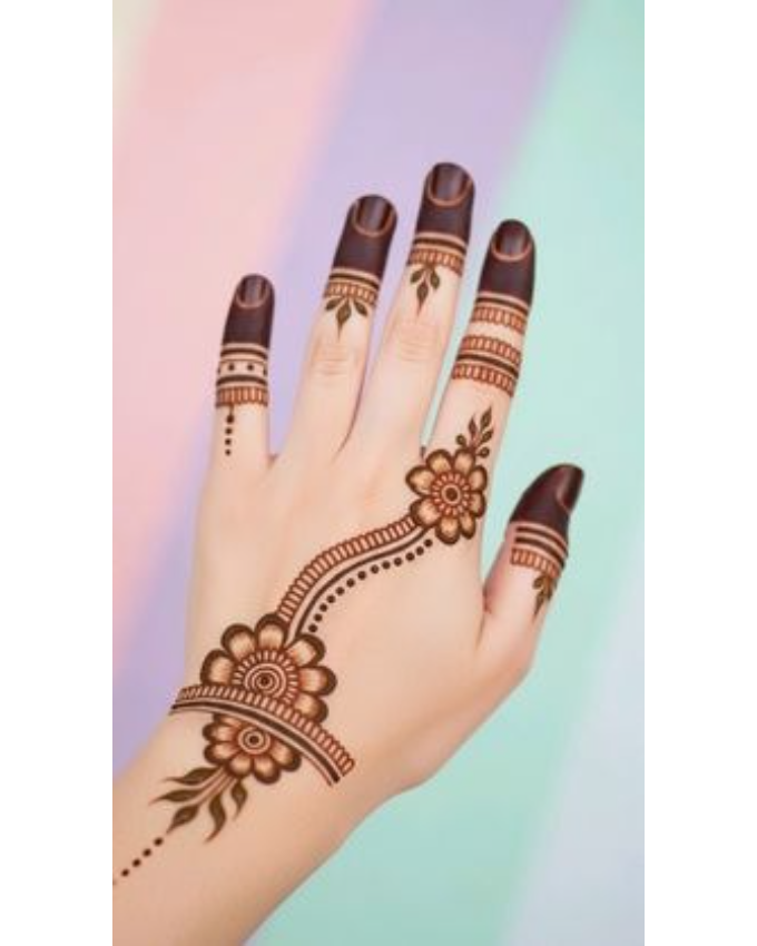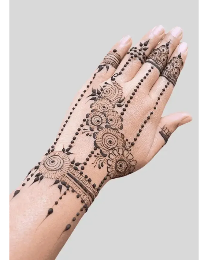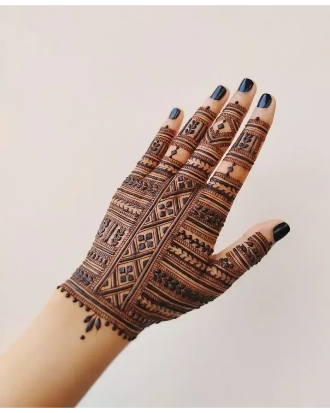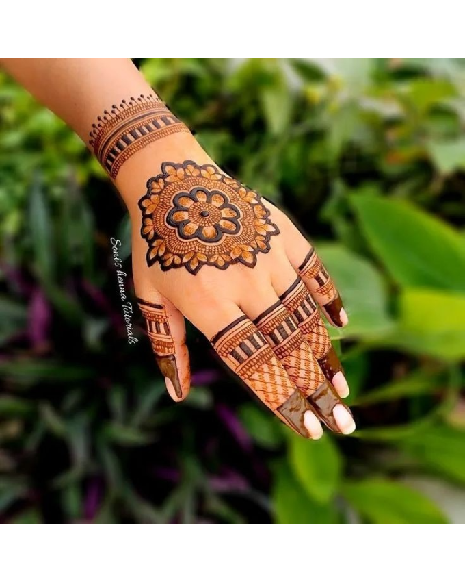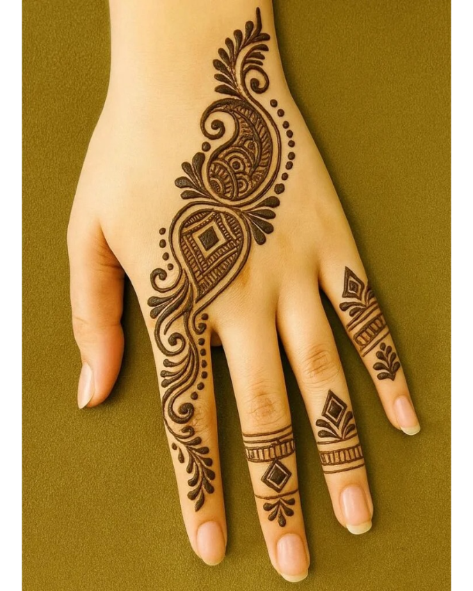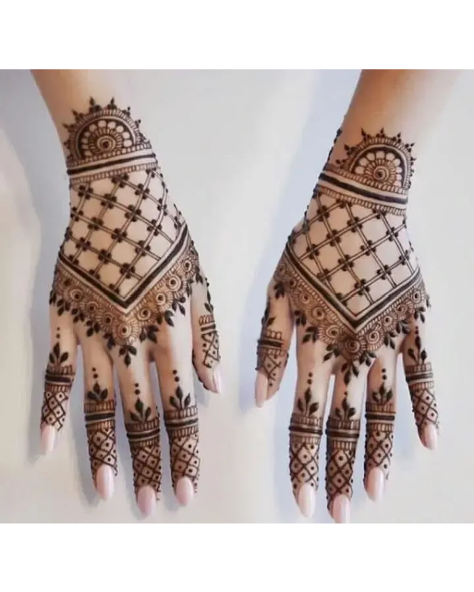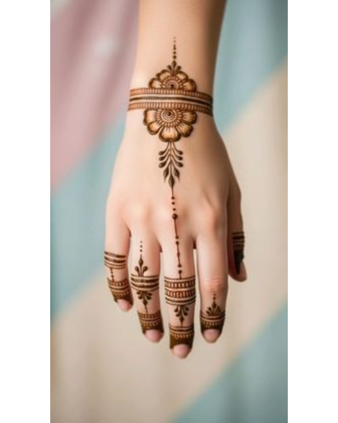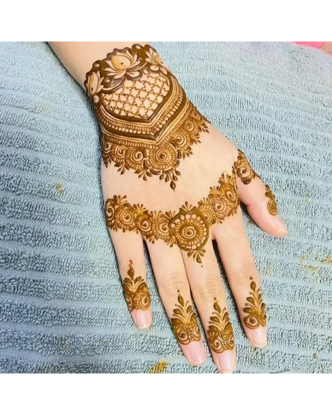 Not everyone has the time or patience for a full, elaborate design. An easy modern back hand mehndi design focuses on clean geometric patterns, simple mandala rings on select fingers, and a neat central motif. These designs typically take 20–30 minutes to apply and still deliver a polished, stylish result.