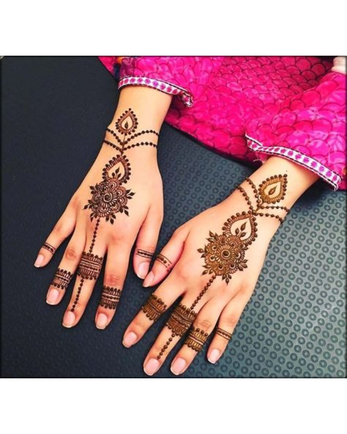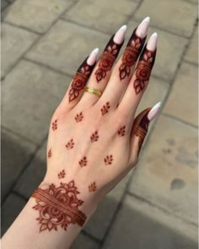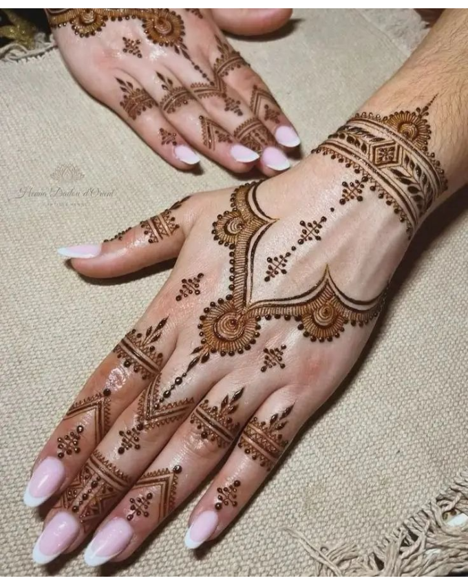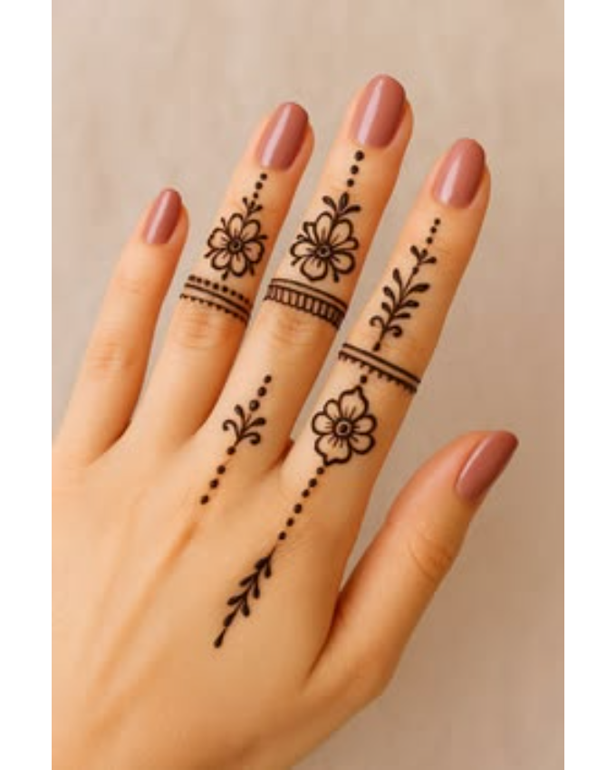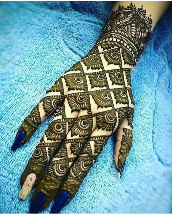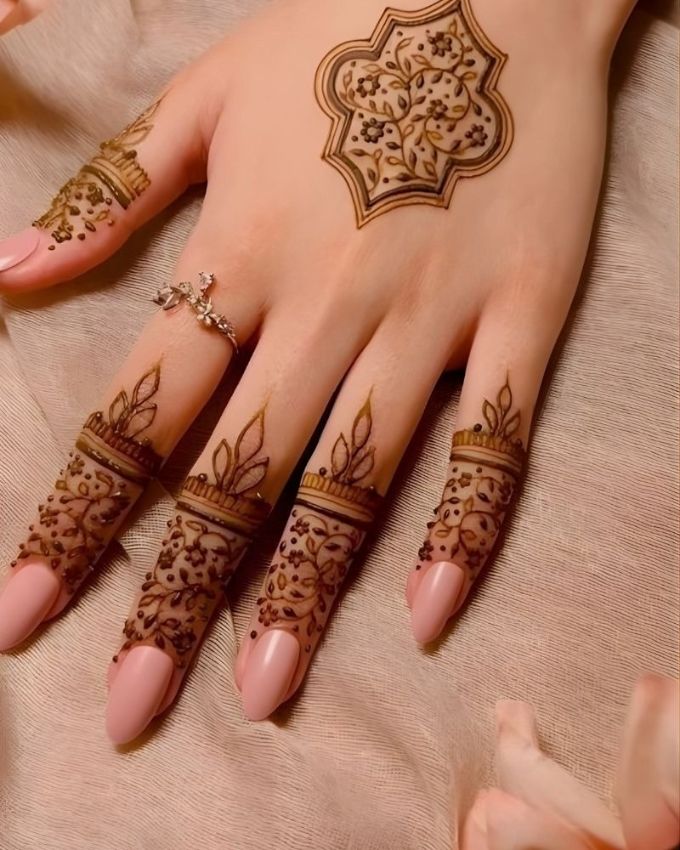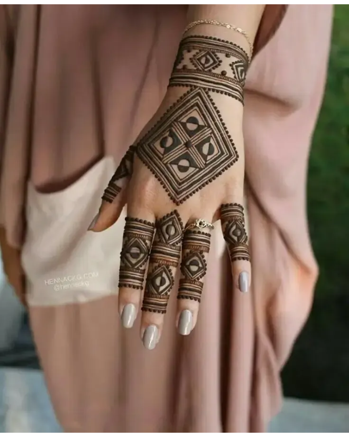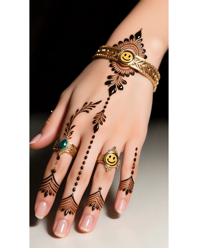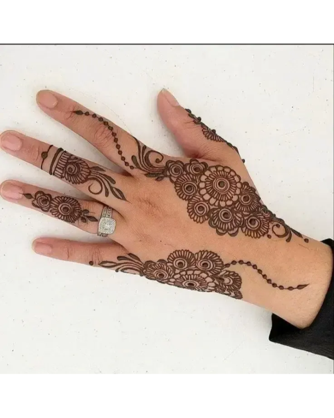 Not everyone has the time or patience for a full, elaborate design. An easy modern back hand mehndi design focuses on clean geometric patterns, simple mandala rings on select fingers, and a neat central motif. These designs typically take 20–30 minutes to apply and still deliver a polished, stylish result.