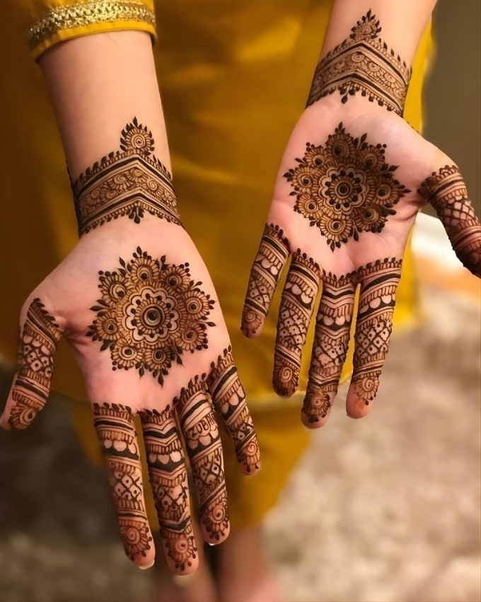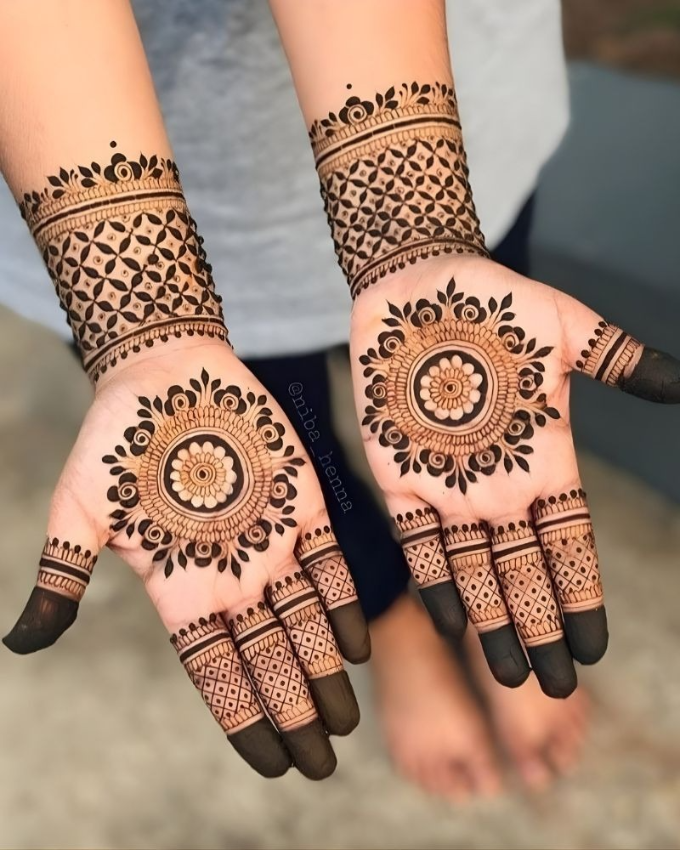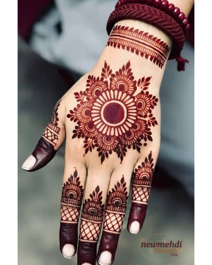 Casual & Everyday Style: A simple Instagram stylish royal front hand mehndi design with a central mandala and minimal finger work looks chic without being overwhelming.