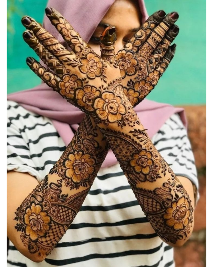 For those who want maximum impact, a stylish full hand mehndi design covers both the front and back hand entirely, along with the fingers and sometimes extends to the forearm. A full hand design in the royal style is a true statement piece — ideal for brides, festival queens, and mehndi artists looking to showcase their finest work.