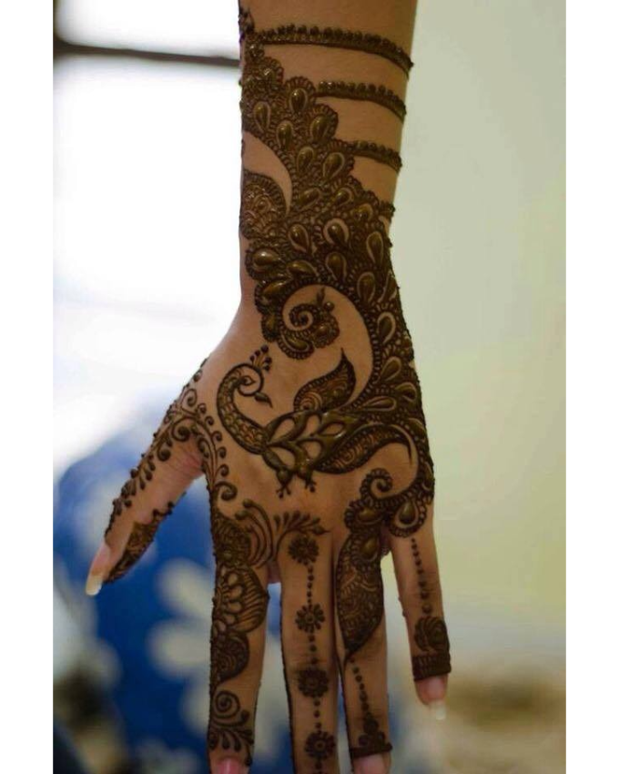 Traditional Indian mehndi is the gold standard of royal henna art. These designs typically feature the iconic peacock at the centre of the palm, surrounded by detailed floral vines, paisleys, and intricate lattice work. The front hand serves as the primary showcase, with bold symmetrical patterns radiating from the wrist to each fingertip. This style is a staple for bridal mehndi ceremonies and is beloved across Rajasthan, Gujarat, and Maharashtra.