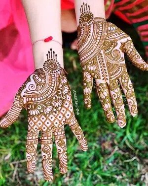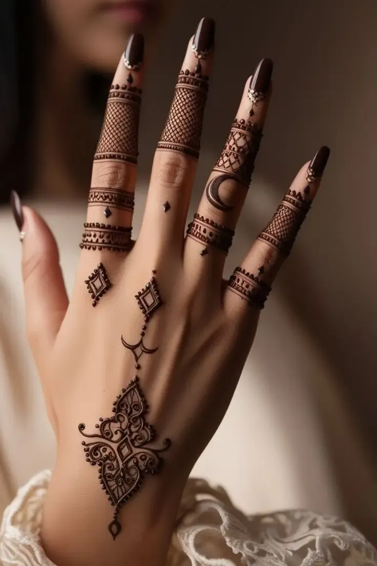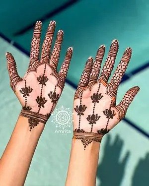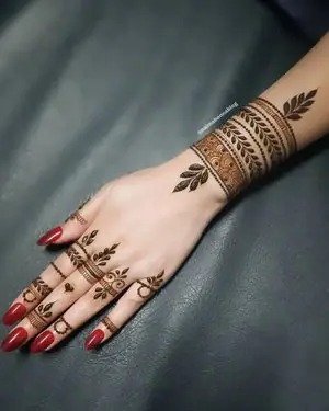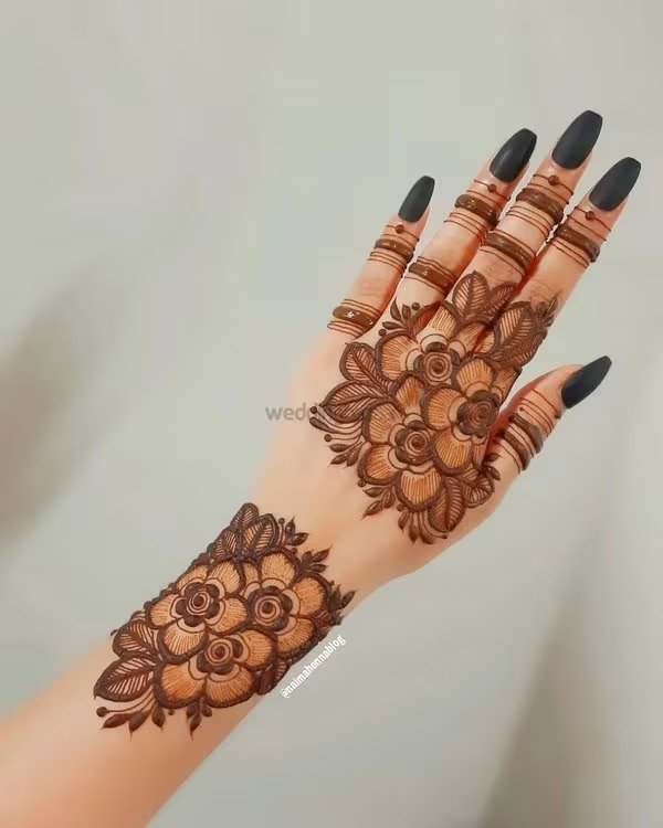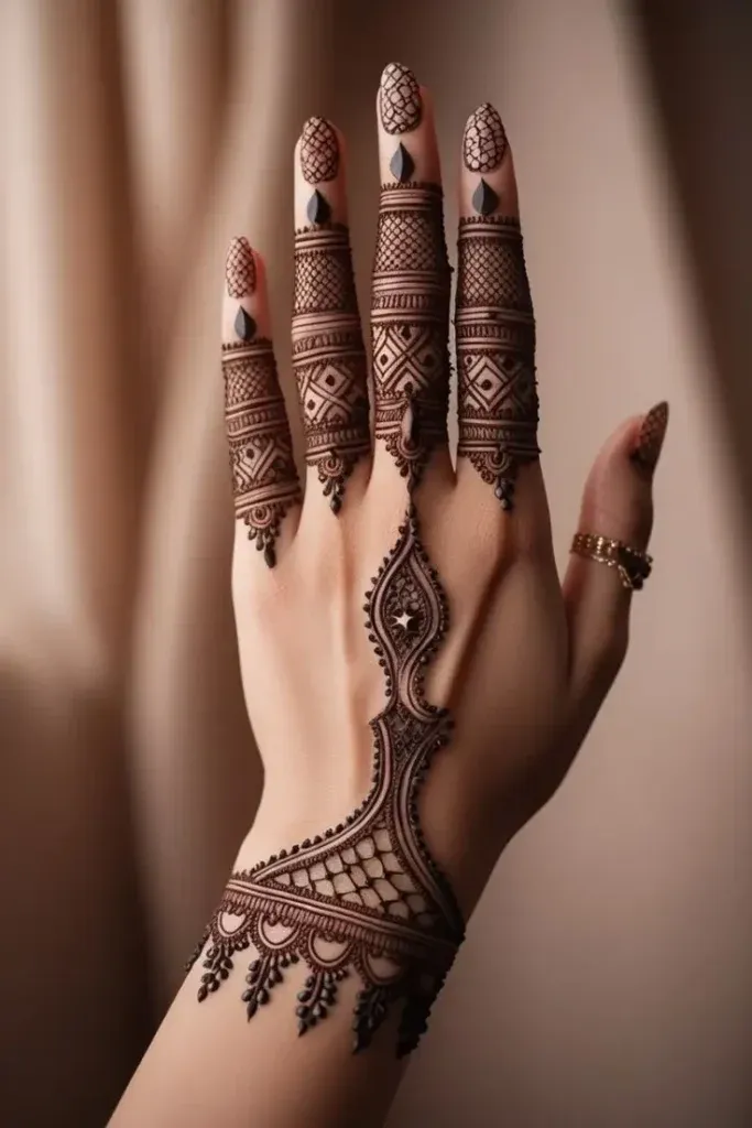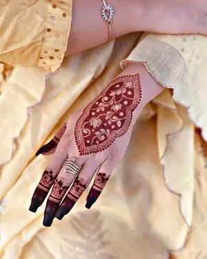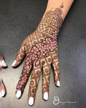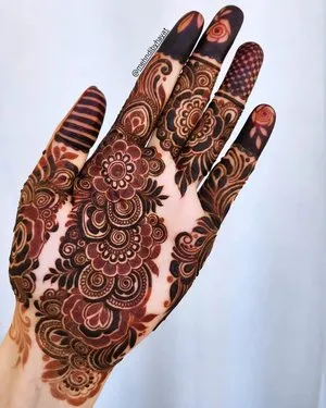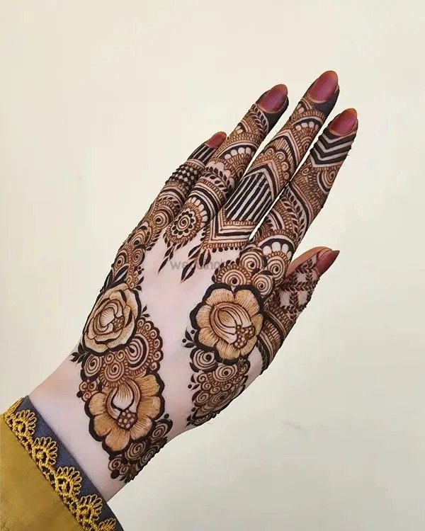 Modern trends in mehndi design focus on creativity, minimalism, and personalization. A modern full hand mehndi design blends traditional elements with contemporary patterns, often incorporating negative space, geometric lines, and minimalist floral arrangements. These designs are ideal for brides and non-brides alike, offering a fresh alternative to heavy traditional patterns. They are especially popular for those seeking a stylish look without compromising elegance, combining elements from both Indian and Arabic styles to create unique, eye-catching compositions.