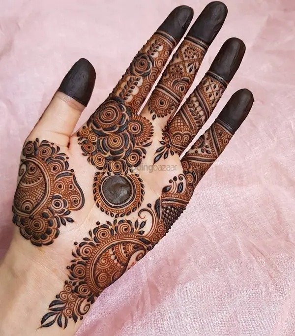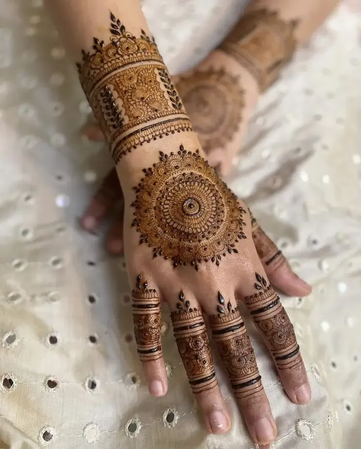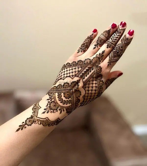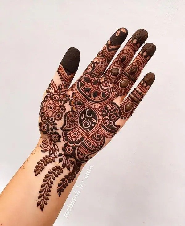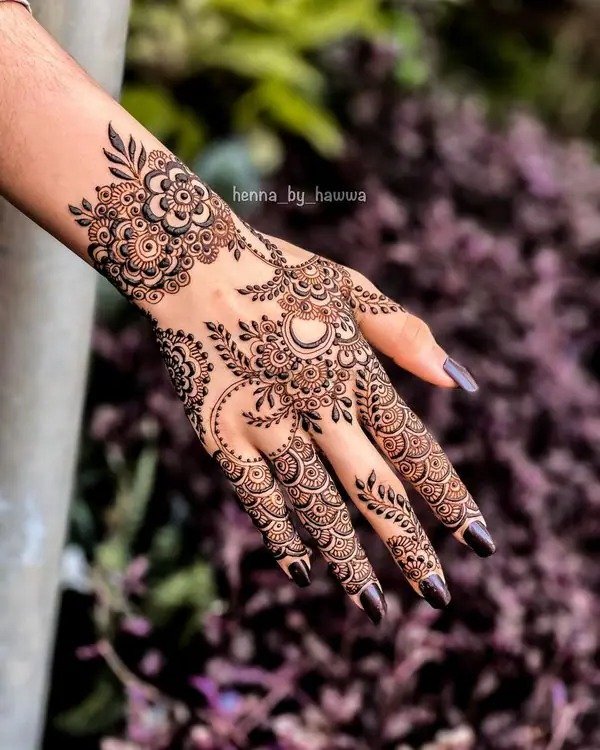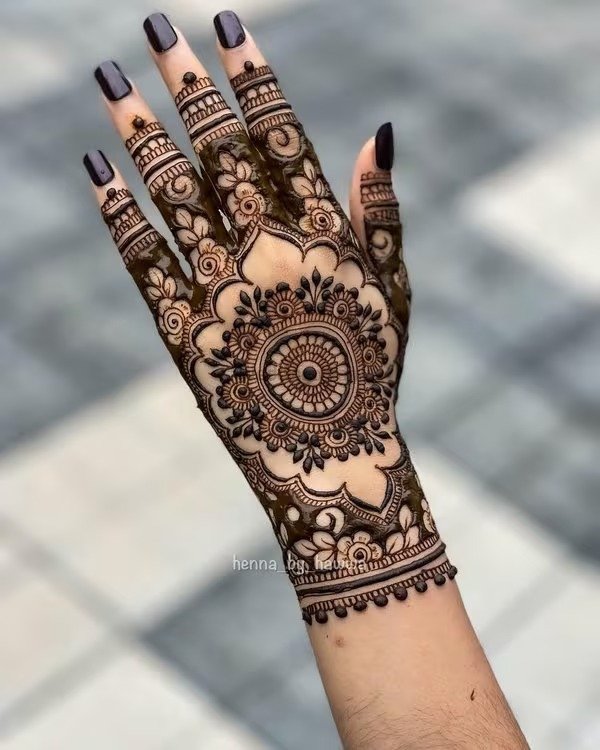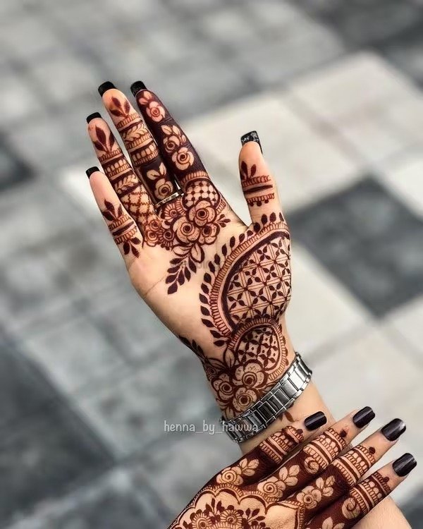 For occasions like Eid, engagements, or festive celebrations, a front full hand mehndi design is an excellent choice. These patterns cover the hand from fingertips to wrist, offering a complete and elegant look. They can range from lace-style borders and interconnected floral chains to mandala-inspired designs at the center of the palm. A front full hand mehndi design balances elegance with sophistication, making it a versatile option that complements jewelry and outfits while keeping the hands stylish and attractive.